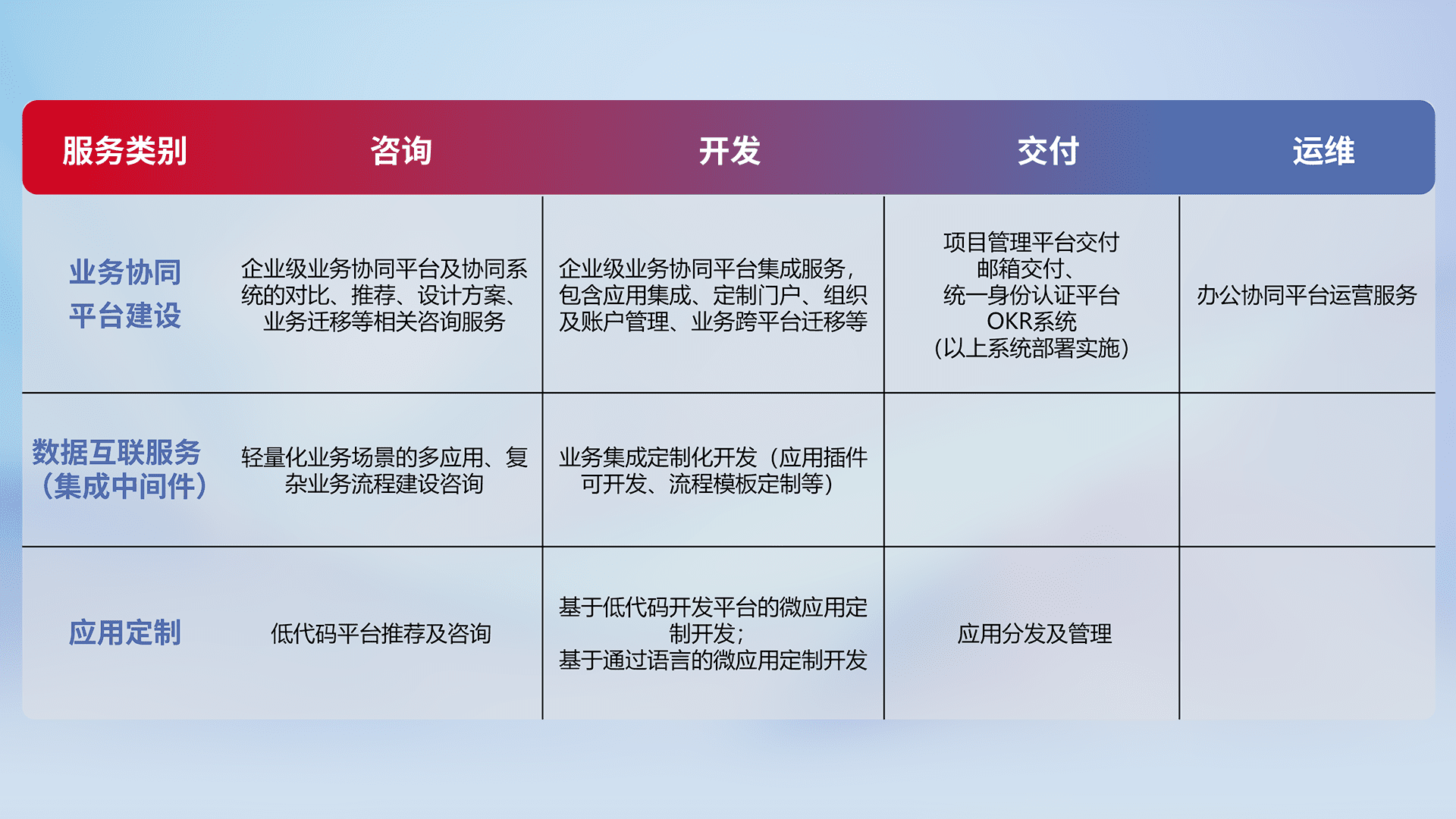 针对钉钉、、、、企微、、、、IDaas等平台级产品提供产品的规划、、、、方案、、、、交付、、、、定制化开发等服务,,,实现如统一协同办公、、智能客户服务、、、混合会议管理、、、智能数据查询、、、等业务场景,,,实现数字化转型。。。。